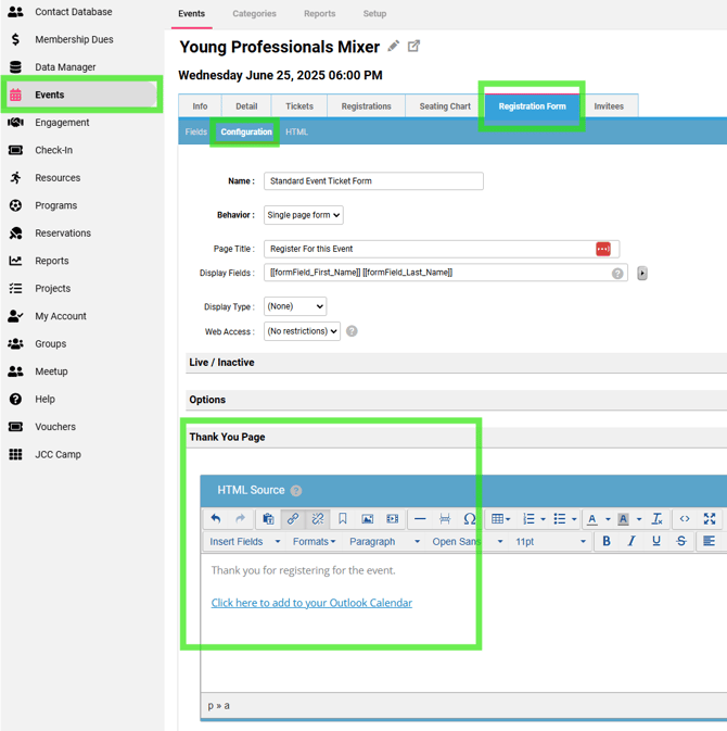In this example, we want to add a link to download a .vcs file on the Event Registration - Thank You Page.