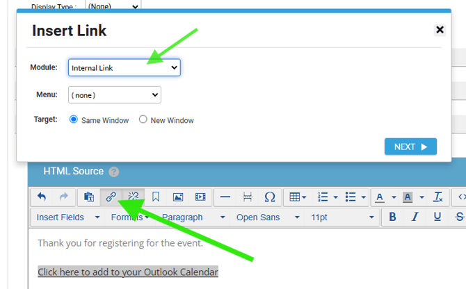 In the WYSIWYG content editor for the Thank You Page, highlight some text and click the link button. Choose "Internal Link" for the Module and press the Next button.