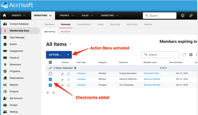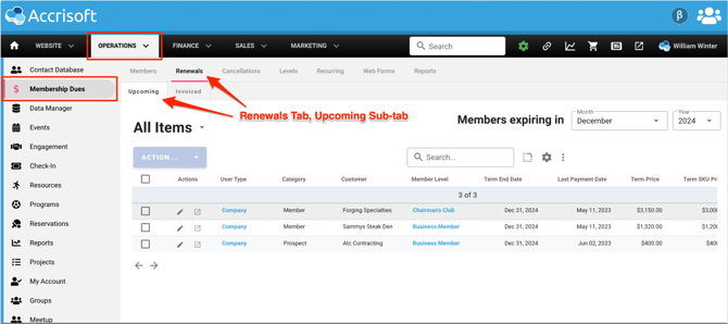 Begin by navigating to Operations Application and select the Membership Dues Module. Select the Renewals tab, and ensure you are on the Upcoming sub-tab.