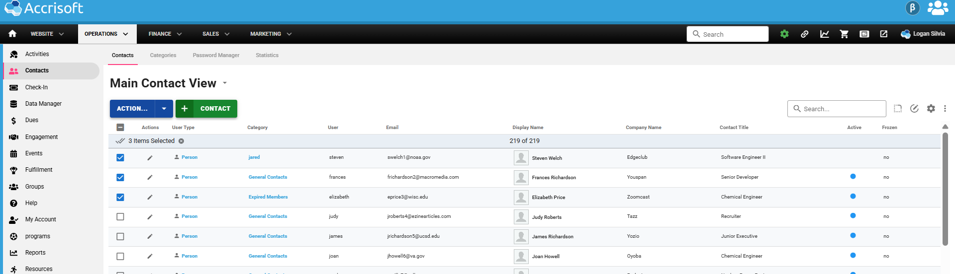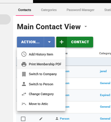 Badges can then be printed by going to the Contact Database module, selecting one or more rows, then opening the Action dropdown and selecting "print".