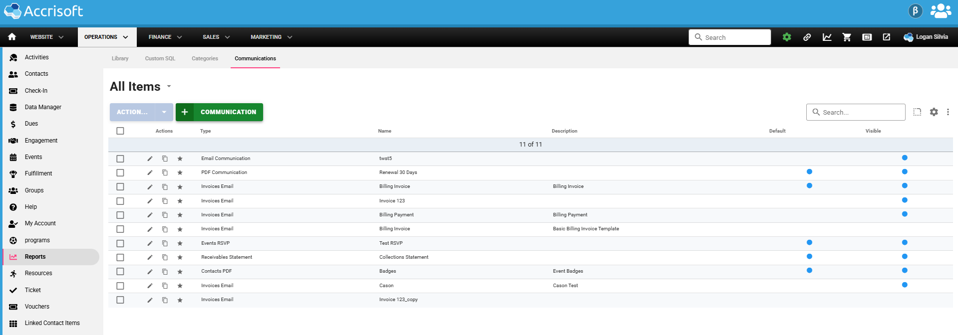 Create and customize invoice, receipt, and badge templates in the Operations app → Reports module → Communications tab using dynamic tags and a body-item editor structure.