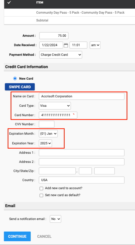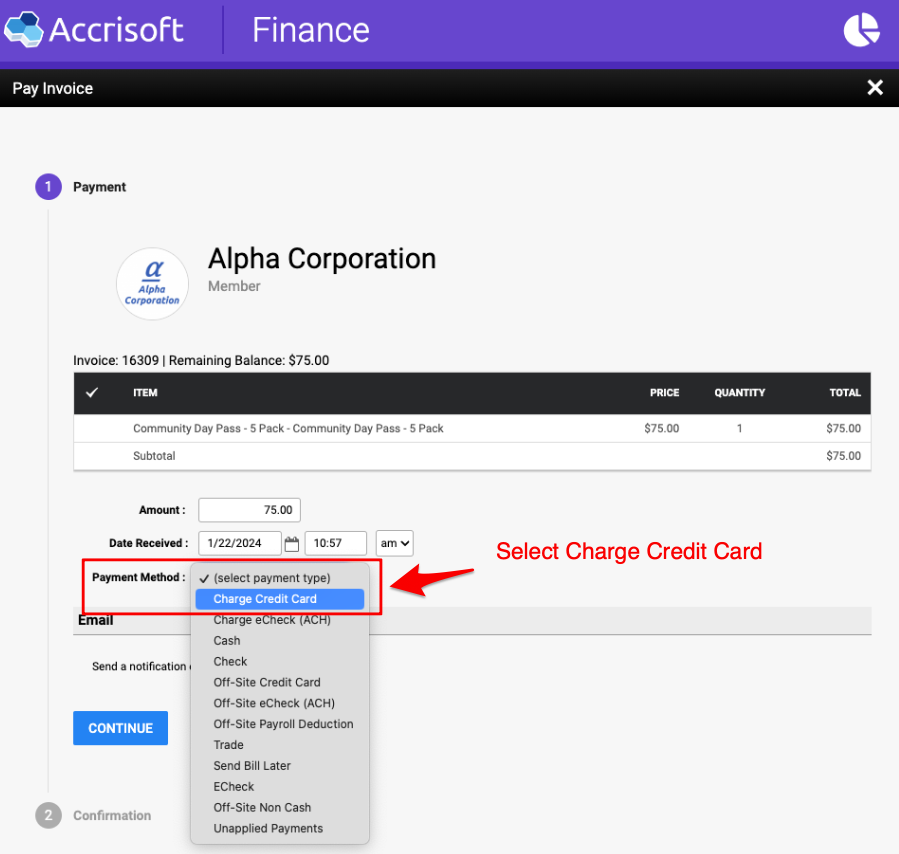 When placing an order in Accrisoft New Finance, process the order as normal and select Credit Card as the payment method.