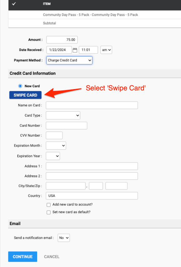With the card card reader already attached to the workstation, swipe the credit card.