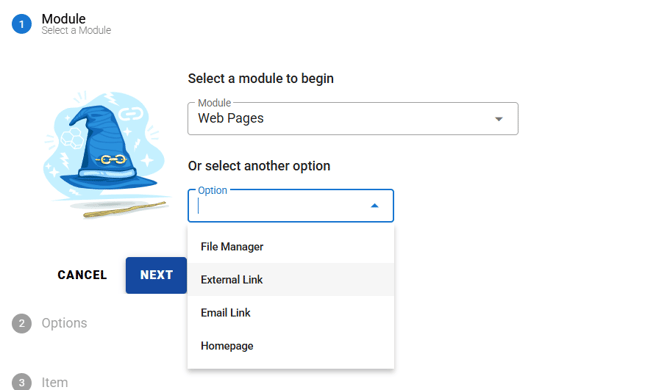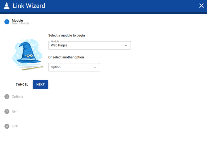 - Choose a module from the Link Wizard (e.g., Web Pages).