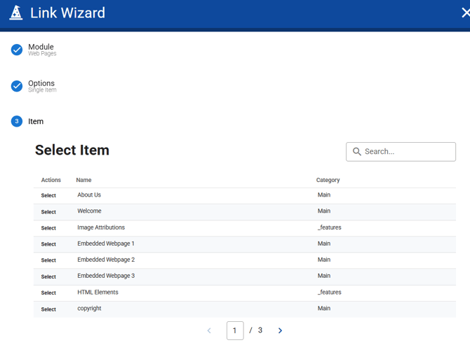 - Module pages (e.g., Web Pages, News, Events) — browse and select any page within that module