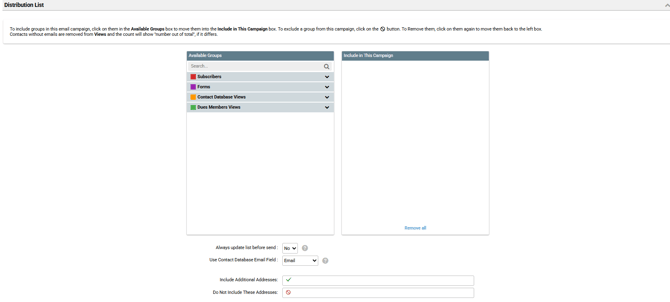 Distribution List: This is where you select who could receive the email. You can choose from pre-built Report Views that pull groups of contacts from various modules, including the contact database, forms, groups, member dues, and imported or created subscriber lists.