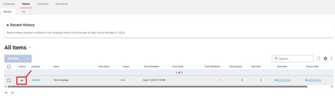 Within 10 days of sending the campaign, click the eyeball icon (View) next to the sent campaign.