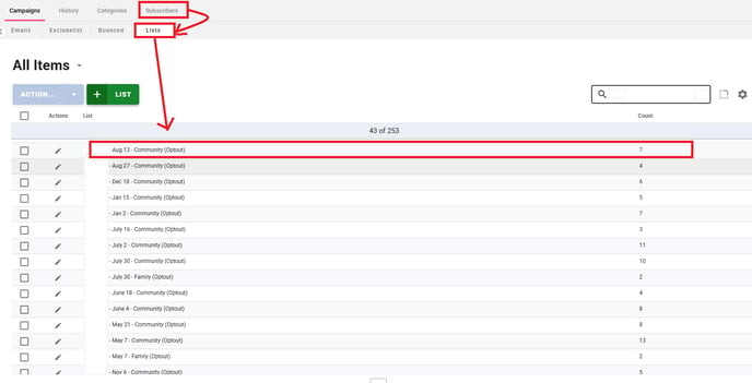 Understanding Dynamic Opt-Out Lists: After a campaign is sent, a corresponding Subscriber List is automatically created for it. These lists can be found in the Subscriber's tab > Lists subtab.